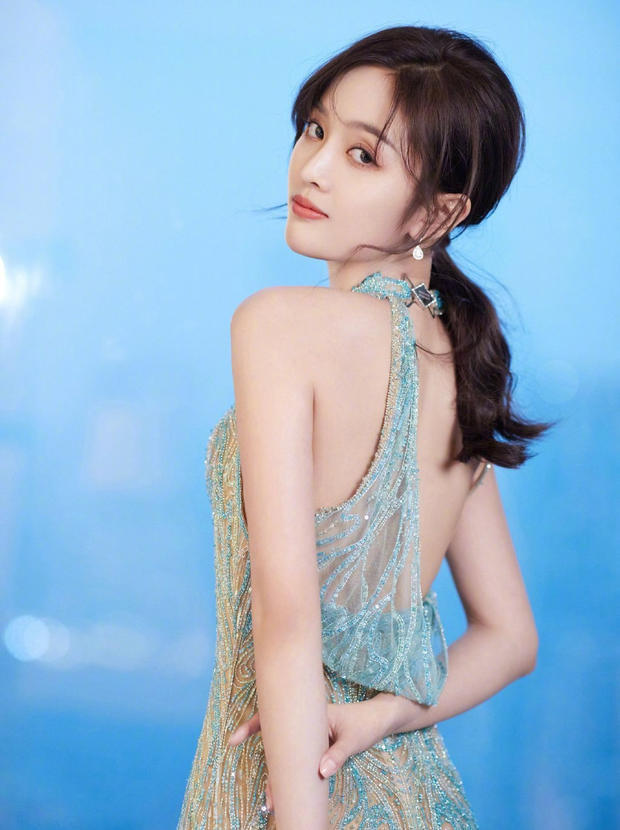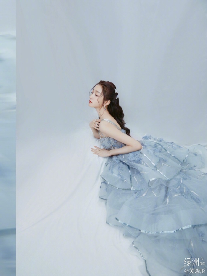 近日,关晓彤在绿洲晒出一组造型图。照片中,她身穿刺绣雾蓝色银河叠层纱裙,小V脸加冷白皮十分优越,小卷发配上蝴蝶头饰仙气十足。